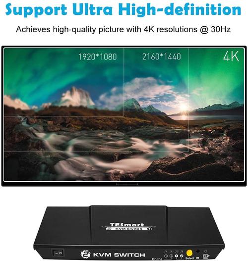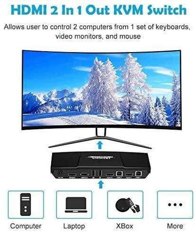 TESmart HKS0201A20 HDMI KVM Switch 2×1 4K@30Hz with 2 Pcs 5ft KVM Cables Supports USB 2.0 Device Control up to 4 Computers/Servers/DVR
