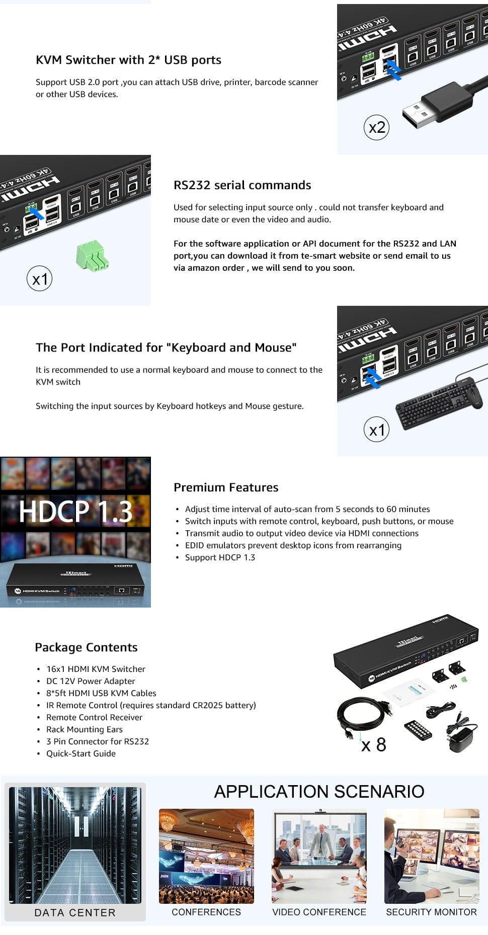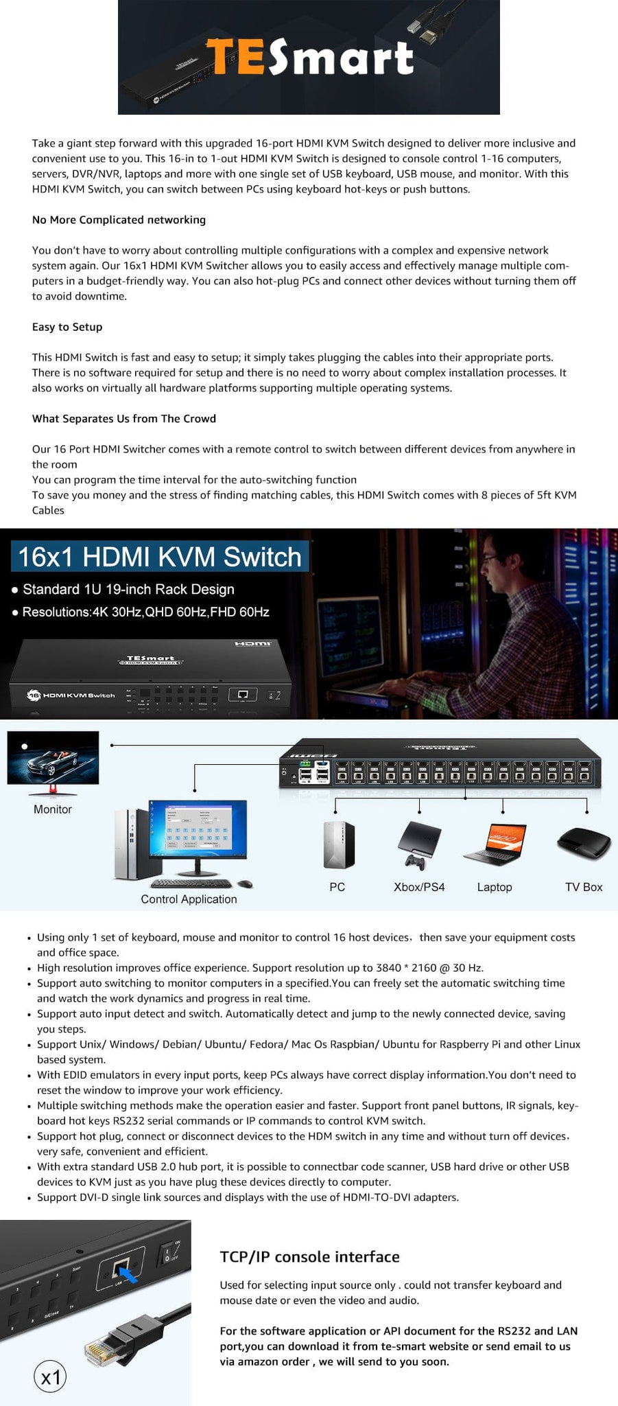 TESmart HKS1601A10 HDMI KVM Switch 16 Port 4K@30Hz Ultra HD | 16×1 KVM Switcher 16 PC 1 Monitor Support IR Remote Control, Auto Scan, RS-232&LAN Control with Extra USB 2.0 Port and 8×1.5m KVM