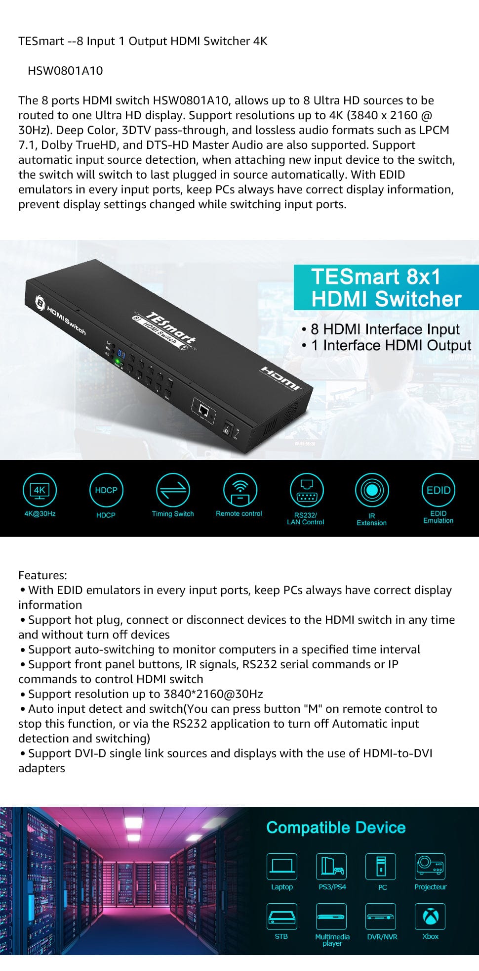 TESmart 8 Port HDMI Switch 4K with Remote Control, 8×1 HDMI Switcher Support 4K@30Hz 1080P@60Hz HDCP, Compatible with HDTV DVD Xbox PS4 Roku TV