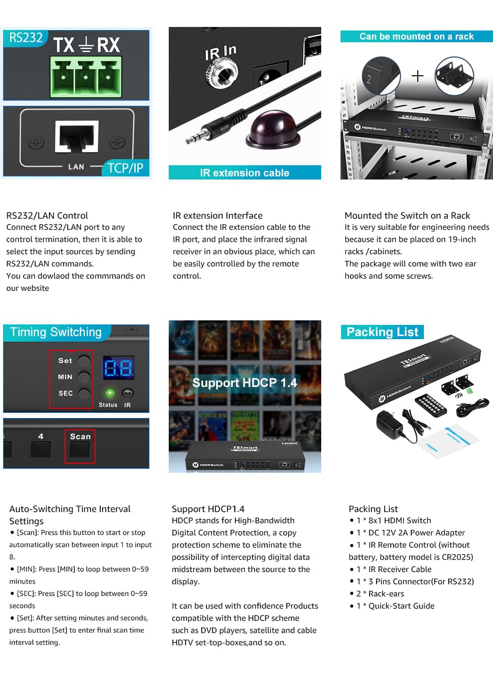 - Support front panel buttons, IR signals, RS232 serial commandsor IP commands to control HDMI switch